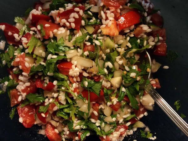 In a bowl mix the rice with the chopped tomatoes, onion and parsley, add some olive oil and half a glass of water, live it to rest for one hour.