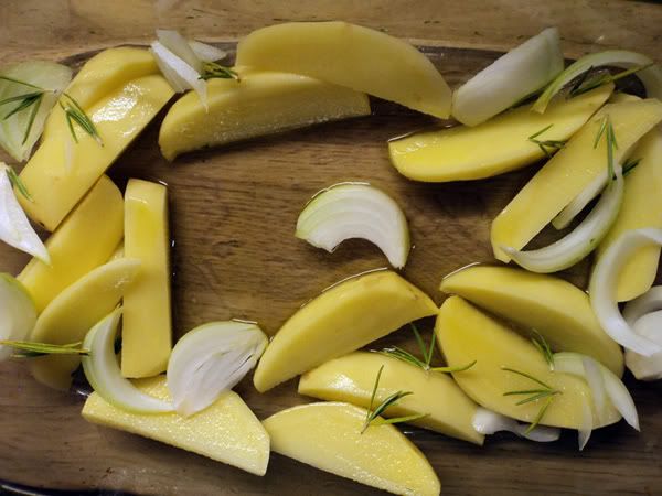 In the meanwhile prepare the baking pan with a bed of potatoes and onion with olive oil and salt.
